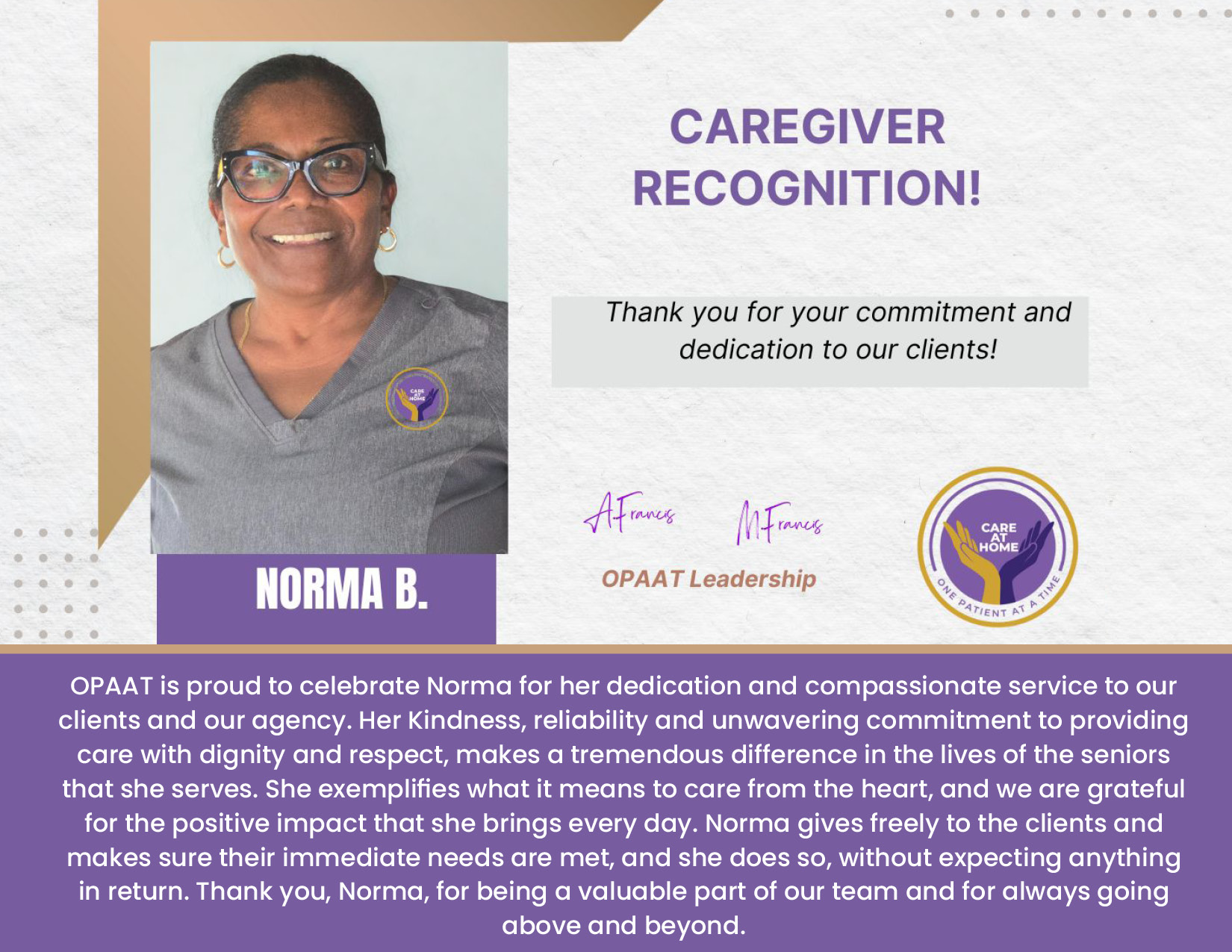 At One Patient at a Time (OPAAT), we pride ourselves in providing exceptional care to seniors in the comfort of their home or other place of residence (i.e. assisted/independent living, long-term care, and short-term rehab facilities). Our highly skilled and dedicated caregivers provide non medical care with dignity, trust, compassion, and respect, “one patient at a time”. When it comes to home care services, you deserve a home care agency that always puts you first. Our focus is on providing seniors with attentive and reliable care that honors their dignity.